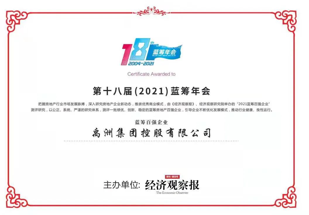 穩(wěn)健前行!禹洲集團獲2021“藍籌百強企業(yè)”等三項榮譽