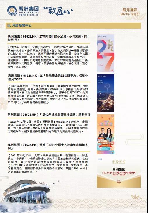 12月12日,禹洲集團于蘇州、合肥、武漢及南京舉行“雙12年終好房節(jié)直播盛典”,直播獲23,344人觀看,34.1萬人點贊,100%天貓直播間活躍度,天貓直播間增粉率更高達74%。是次直播的亮麗表現(xiàn)再次證明集團強勁的產(chǎn)品力,更加直面反映出市場對集團認受性,秉承“以初心,致匠心”理念,集團持續(xù)提供超卓產(chǎn)品,建造更美好城市。集團秉持“以誠建城,以愛筑家”的理念,一直加強可持續(xù)發(fā)展管理,積極履行企業(yè)社會責任,實現(xiàn)有質(zhì)量的增長。