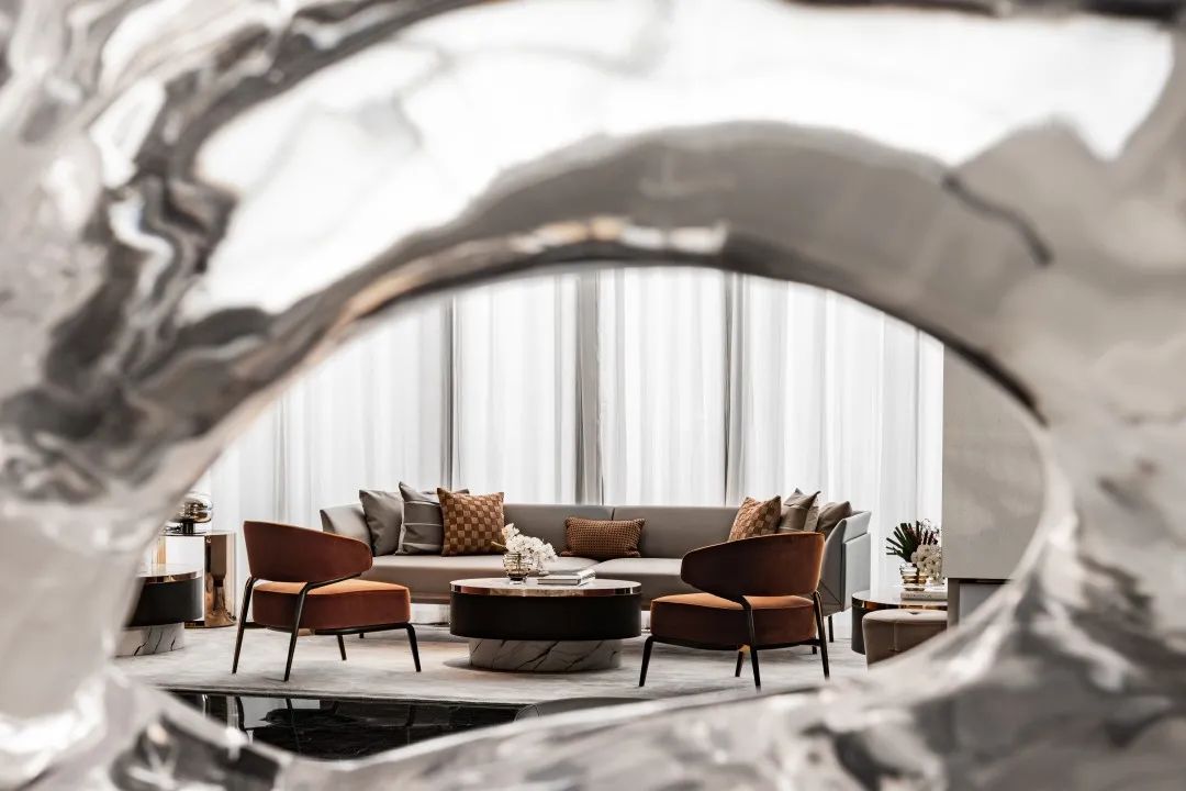 沙發(fā)與挑空的大廳之間構(gòu)筑出了通透的空間視野,色調(diào)柔順、舒適、自然。延續(xù)著云與水的韻味和優(yōu)雅精致的調(diào)性,也彰顯著和諧大氣、簡(jiǎn)約形意的空間氣質(zhì)。