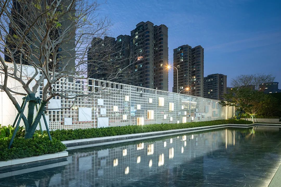 鏡面水景映襯著建筑與景墻,彼岸則仿佛漂浮于水面之上;每當(dāng)夜幕降臨,月懸浮于境面之上,仿佛伸手觸碰就能攬入懷中。而遠(yuǎn)處層疊錯(cuò)落的特色種植池像島又像山,影影綽綽地籠罩著一層輕紗,幽秘而靈動(dòng)。