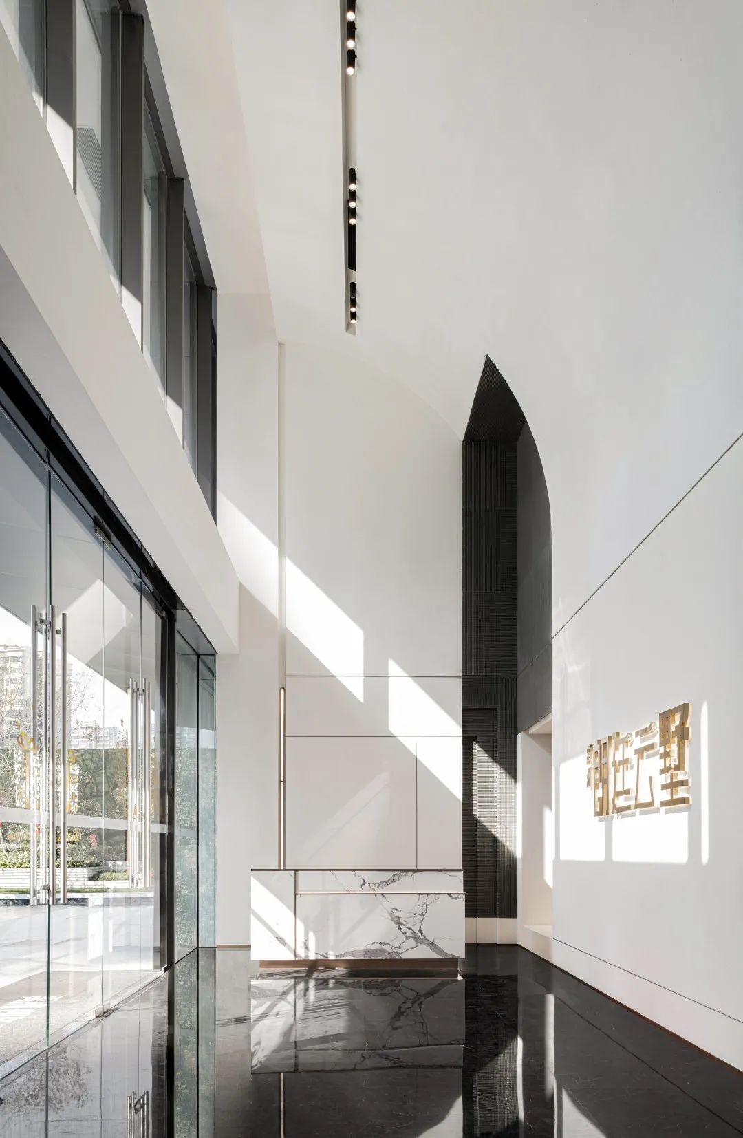 弧形臺(tái)階與門(mén)樓圓頂以繪畫(huà)般的弧度平行,登門(mén)而上,給予每個(gè)業(yè)主及來(lái)訪者如步入殿堂般的儀式感;而入門(mén)處水面的波光與門(mén)樓的燈光星星點(diǎn)點(diǎn)地交相輝映著,更有天光流瀉而下,聚氣于此,為人們創(chuàng)造出一片遠(yuǎn)離塵世的藝術(shù)場(chǎng)域。