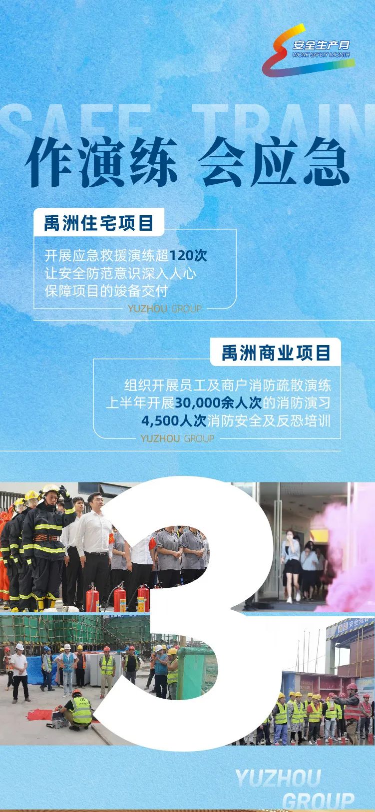 對(duì)于人員密集的商業(yè)項(xiàng)目,禹洲也同樣結(jié)合各項(xiàng)目安全生產(chǎn)工作特點(diǎn),修訂完善重點(diǎn)應(yīng)急預(yù)案,并組織開(kāi)展員工及商戶消防疏散演練,成立指揮部及各應(yīng)急小組,以高度責(zé)任心和敬畏心對(duì)待安全運(yùn)營(yíng),在上半年開(kāi)展30,000余人次的消防演習(xí),4,500人次消防安全及反恐培訓(xùn),進(jìn)一步提升應(yīng)對(duì)突發(fā)事件的能力。